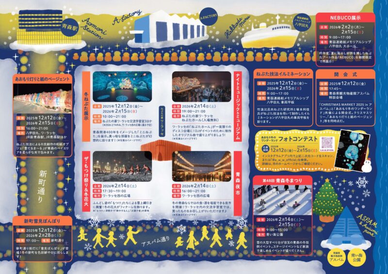 期間中は、毎年恒例の人気イベントに加え、今年ならではの新たな企画も登場。 街全体がにぎわい、昼も夜も青森の冬を存分に楽しめます。